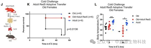 研究人员通过引入一种分子,促进了老年小鼠体内可以产生更多的ILC-2细胞,但是情况却并没有好转:通过刺激,老年小鼠体内的ILC-2细胞数量恢复了,但老年小鼠的耐寒能力却更差了!