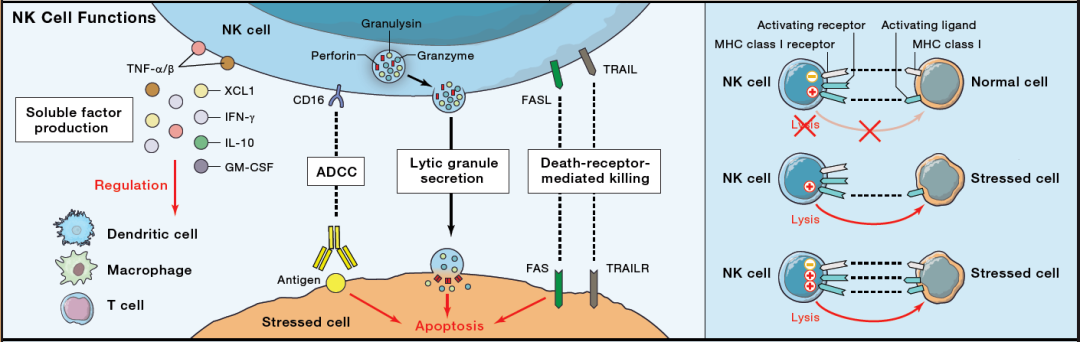 免疫细胞治疗之所以风靡癌症治疗,靠的是它的精准识别与杀伤能力。CAR-T细胞通过基因工程手段获得针对肿瘤抗原的“导航系统”,一旦识别目标,即可释放穿孔素、颗粒酶B,精准击杀。NK细胞和CIK细胞则依赖自然或激活型受体寻找异常表达信号,实现快速免疫攻击。