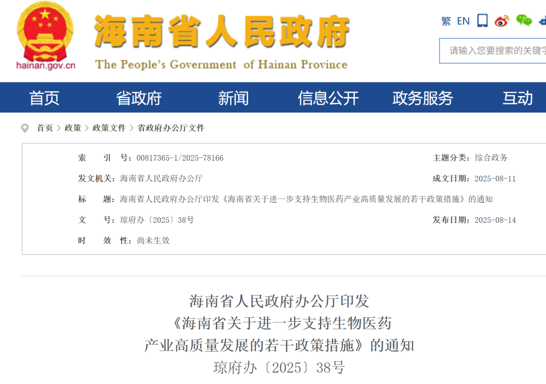 2025年8月,海南省政府正式印发《海南省关于进一步支持生物医药产业高质量发展的若干政策措施》,引发了产业界的高度关注。自贸港背景下,海南向来是医药创新与制度先行的“政策试验田”,如今再度释放政策红利,剑指创新药、细胞与基因治疗、真实世界数据应用、国际化布局等前沿领域。