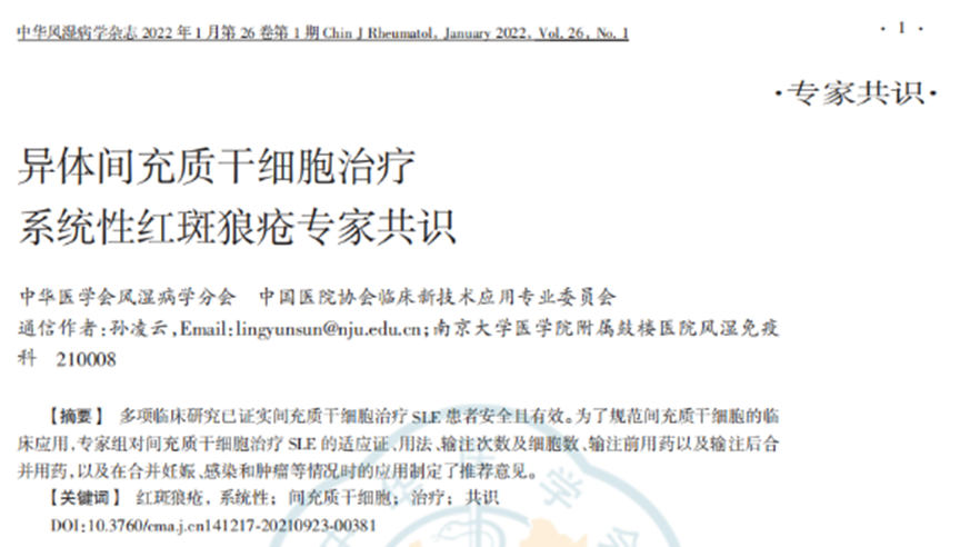 近年来,随着临床研究的进展,间充质干细胞(MSCs)已成为了系统性红斑狼疮的临床新选择。根据我国《中华风湿病学》杂志发表《异体间充质干细胞治疗系统性红斑狼疮专家共识》(下称《专家共识》),“多项临床研究已证实间充质干细胞治疗系统性红斑狼疮患者安全且有效。间充质干细胞治疗大大提高了系统性红斑狼疮患者的疗效,改善了系统性红斑狼疮患者的生存质量和预后。”