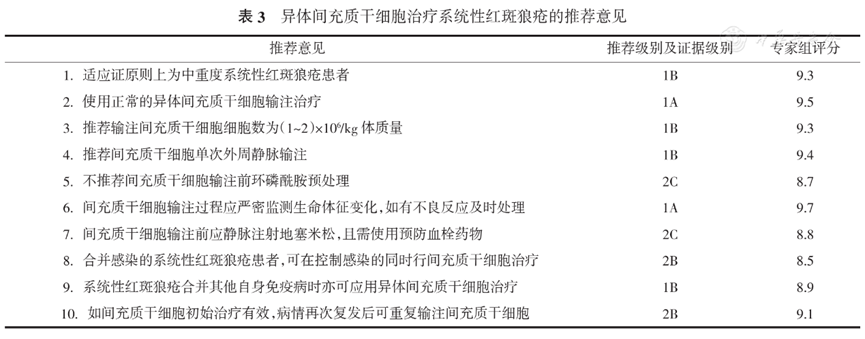 在国内,专家组对间充质干细胞治疗系统性红斑狼疮的适应证、用法、输注次数及细胞数、输注前用药及输注后合并用药以及在合并其它自身免疫病、缓解后复发等情况时的应用推荐意见。