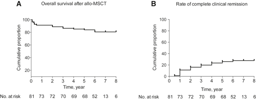 间充质干细胞移植后患者的生存和临床缓解总体生存(A)和完全临床缓解(B)