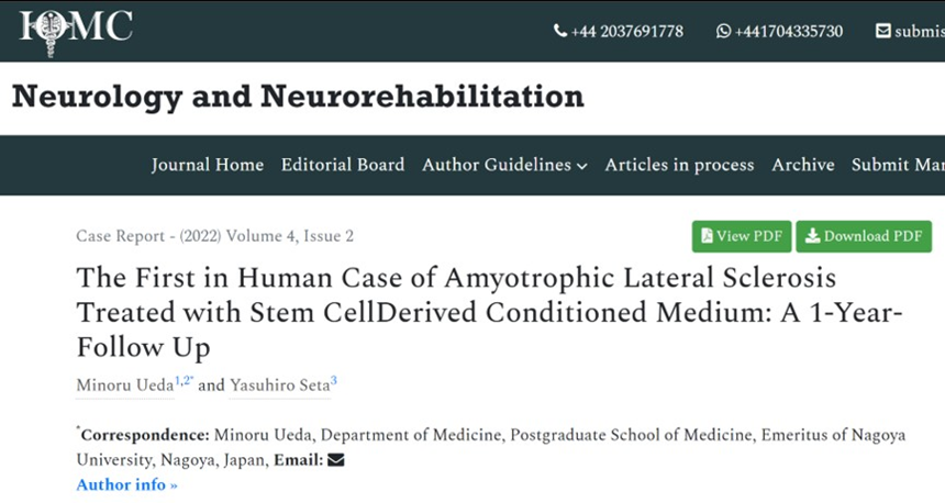 2022年,来自日本的研究团队报告了一例通过经鼻和静脉内注射人牙髓干细胞条件培养基治疗渐冻症(ALS)的临床病例[2],这是首例使用干细胞条件培养基治疗人类渐冻症的病例报告,该治疗显著改善了患者的肌肉力量的和肺功能,有望为渐冻症提供一种新型的无细胞疗法。