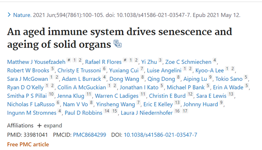 从免疫细胞的角度:1962年免疫学专家Walford提出,随着年龄的增长,免疫器官老化、免疫细胞数量降低,脑、心、肺、肾和肝等重要器官的生理功能下降,将导致人体逐渐出现身体上的不适,增加疾病的发病率。2021年,美国明尼苏达大学医学院的学者在《Nature》上发表了关于衰老的相关文章[4],证实了衰老细胞是机体衰老的关键因素,其中免疫细胞的衰老是重中之重,衰老的免疫细胞会加速其他器官衰老,从而加快全身性衰老进程。