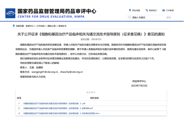 2023年7月25日,国家药监局药审中心发布: 细胞和基因治疗产品的临床研发进展迅速,申请人对相关产品的沟通交流需求也与日俱增。我国尚无针对细胞和基因治疗产品沟通交流临床相关指导原则出台,为增进申请人对此类产品临床研发要素的理解,便于申请人准备临床相关沟通交流申请时的资料,提高沟通交流效率,我中心起草了《细胞和基因治疗产品临床相关沟通交流技术指导原则》。经中心内部讨论,已形成征求意见稿。
