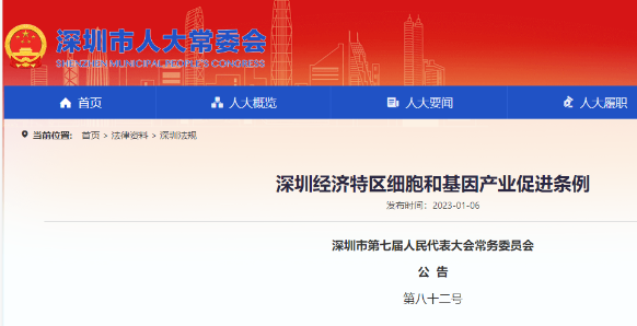 2023年1月6日深圳市人大常委会发布全国首部细胞和基因产业促进条例《深圳经济特区细胞和基因产业促进条例》,2023年3月1日起施行。该《条例》是全国首部细胞和基因产业专项立法。