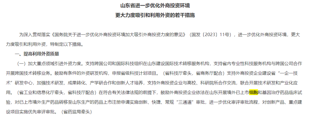 2023年10月20日,山东省人民政府印发《山东省进一步优化外商投资环境更大力度吸引和利用外资的若干措施》。该文件包括6方面23条具体措施,提到鼓励外商投资企业依法在山东开展境外已上市细胞和基因治疗药品临床试验,对已上市境外生产药品转移至山东生产的药品上市注册申请优化审评审批流程。