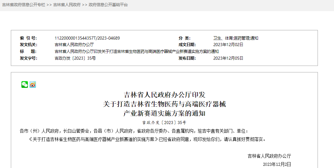 2023年12月5日吉林省人民政府办公厅印发《关于打造吉林省生物医药与高端医疗器械产业新赛道实施方案》的通知,重点任务是聚焦产业高端,对标国际领先产品,抢占生物医药产业新高地。