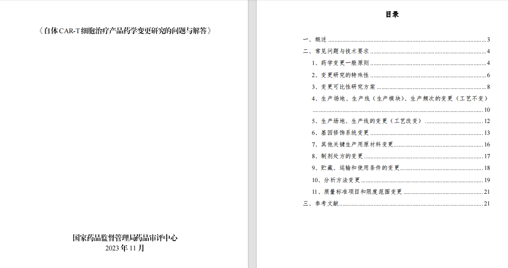 为了更好地引导CAR-T类细胞治疗产品药学变更的研究与申报,提高申请人和监管机构沟通交流的质量和效率,国家药品监督管理局药品审评中心组织对临床试验至上市后阶段的自体CAR-T产品常见的药学变更问题进行了梳理,制定了《自体CAR-T细胞治疗产品药学变更研究的问题与解答》,予以发布。