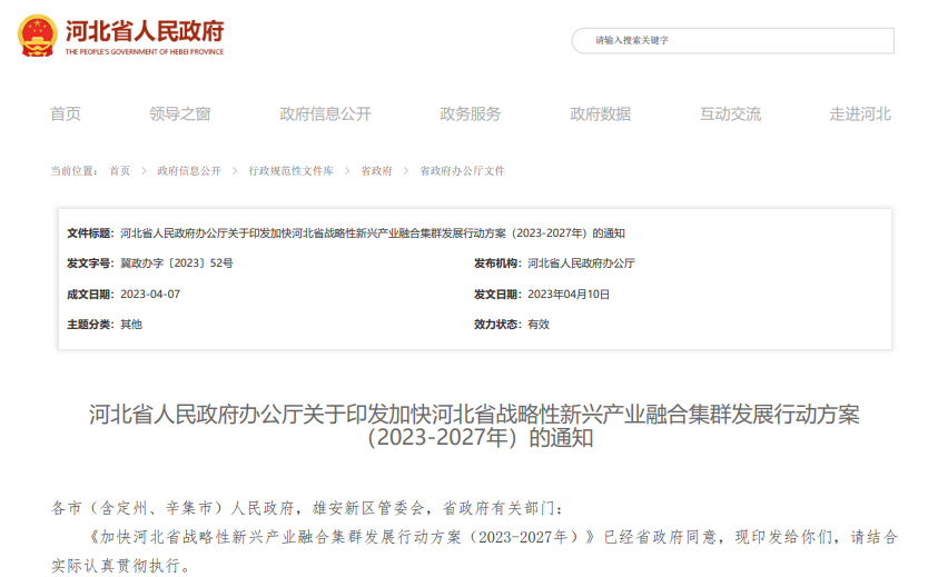 2023年4月10日河北省政府办公厅印发《加快河北省战略性新兴产业融合集群发展行动方案(2023-2027年)》,提出力争生物医药、新一代信息技术、新能源汽车和智能网联汽车3个产业集群营业收入率先突破千亿级;支持石家庄生物医药产业集群发展生物技术药、高端化学药、现代中药、高端医疗器械、大健康等产业链条。