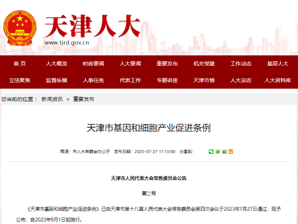 2023年7月27日天津市第十八届人民代表大会常务委员会第四次会议正式通过《天津市基因和细胞产业促进条例》,在细胞采集和储存、研发和临床试验、拓展性使用和拓展性临床试验、应用和生产、科学性审查和伦理审查、促进和保障等方面提出了支持措施和监管要求。