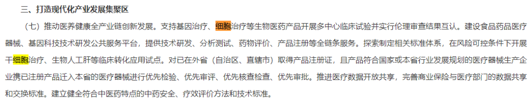 其中明确提出:根据国家有关要求,持续做好细胞治疗临床研究省级初审、备案、监管。支持细胞和基因治疗、罕见病等细分领域发展。