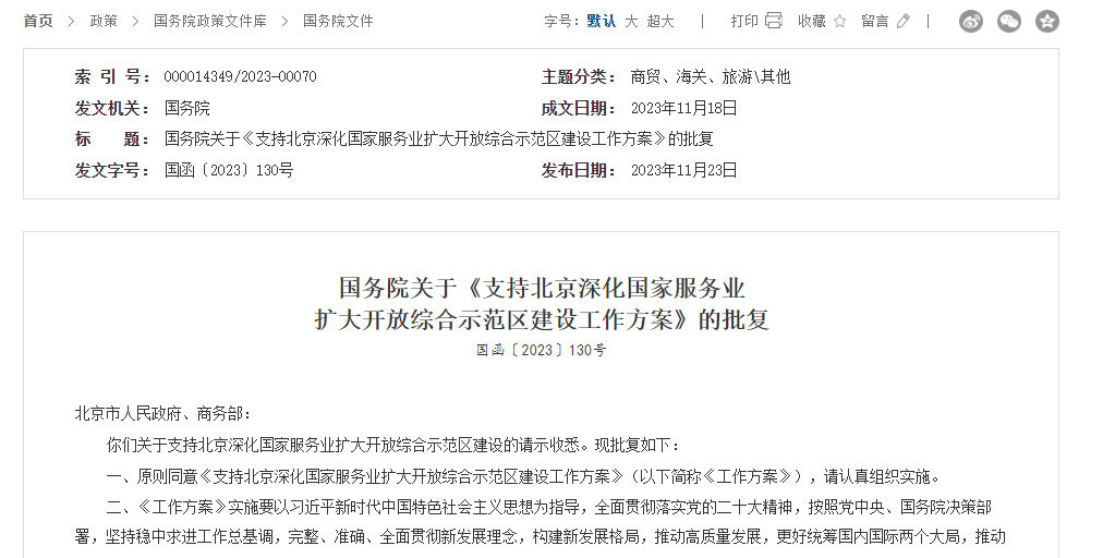 关于《支持北京深化国家服务业扩大开放综合示范区建设工作方案》的批复