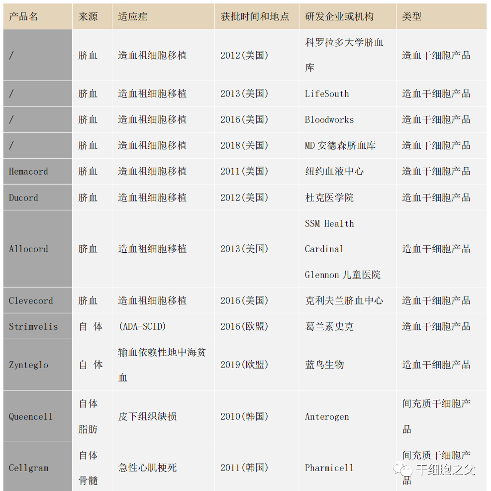 目前全球已上市的干细胞产品已有 21 款,其适应症一览: