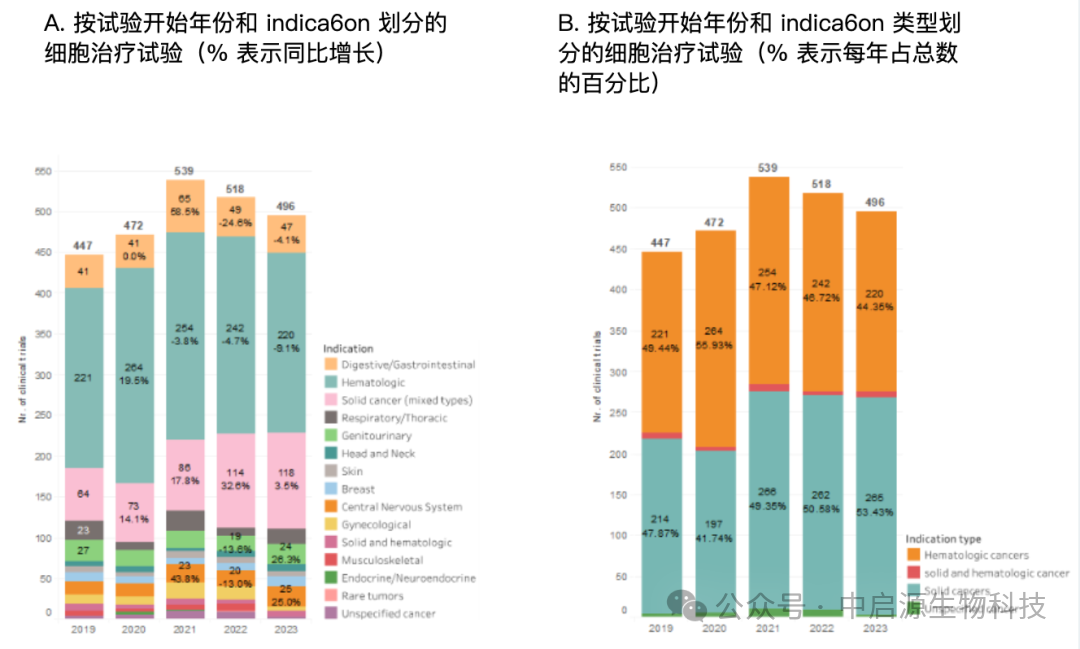 传统上,免疫细胞疗法主要应用于血液系统肿瘤(白血病、淋巴瘤等),但近三年数据表明,实体瘤的研究试验增速已经超过血液系统肿瘤:
