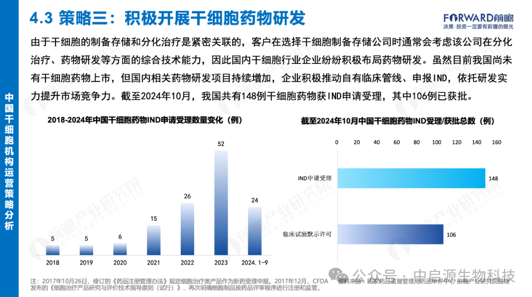 截至2024年10月,中国共有148项干细胞药物的IND申请获受理,其中106例已获批。截至2024年9月,中国在细胞疗法领域共有约64项IND和NDA申请进展,其中60项为IND申请。