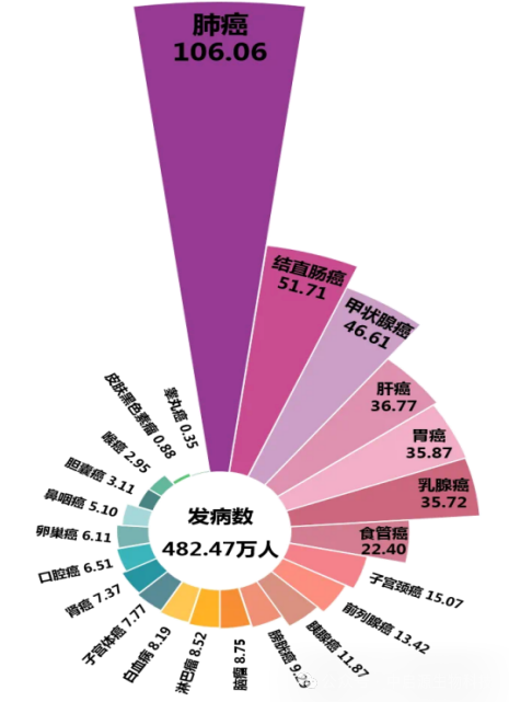 根据国家癌症中心发布的数据显示,2022年我国癌症新发病例为482.47万,肺癌、肝癌、胃癌发病率居前三(详见图1),男性世标发病率高于女性(209.61/10万vs197.03/10万,详见图2)