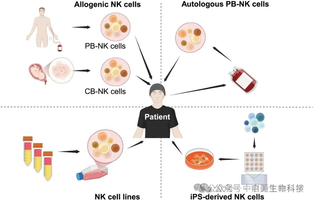 ▲用于癌症免疫治疗的NK细胞来源