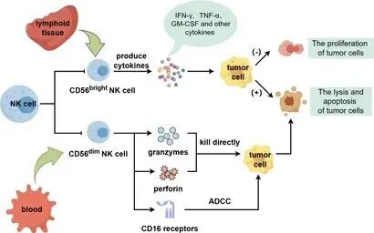 CD56dim:占循环NK细胞的90%,穿孔素和颗粒酶含量高,能直接裂解肿瘤细胞,并通过CD16介导抗体依赖性细胞毒作用(ADCC)。