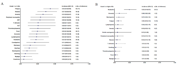 ▲不良事件总体发生率与 95% CI 的森林图。(A) . 1 级或 2 级不良事件;(B) . 3 级或更高级别不良事件