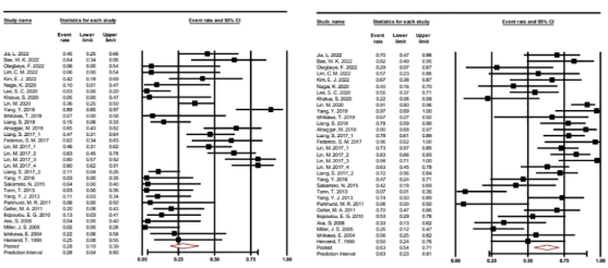 ▲总缓解率 (ORR) 与疾病控制率 (DCR) 的森林图(95% CI)。采用随机效应模型。ORR:0.282(95% CI:0.914–0.389)。异质性:I2 = 77.192%;p = 0.000。DCR:0.632(95% CI:0.543–0.713)。异质性:I2 68.347%;p = 0.000。CRR,完全缓解率;ORR,总缓解率
