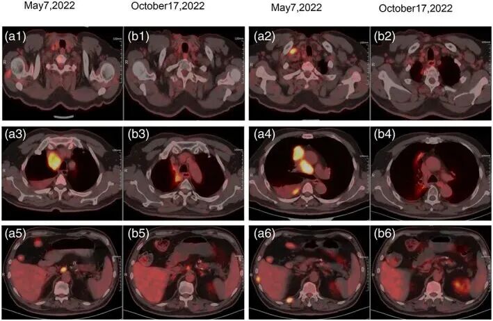 ▲治疗5个月后,18F-脱氧葡萄糖正电子发射断层扫描/计算机断层扫描(18F-FDG PET-CT)图像的对比