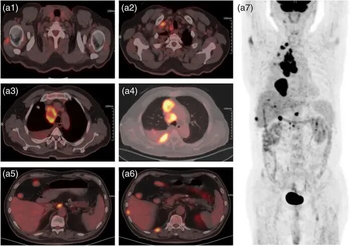 ▲治疗前2022年5月拍摄的18F氟代脱氧葡萄糖正电子发射断层扫描/计算机断层扫描(18F-FDG PET/CT)图像