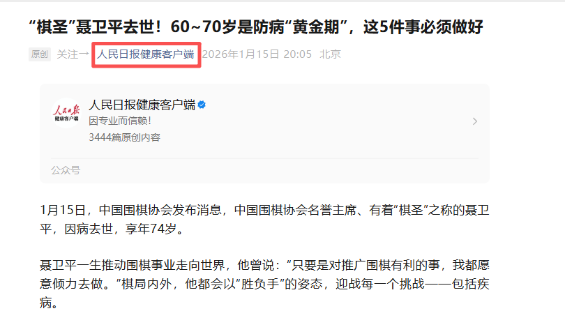 2026年1月15日,中国围棋协会发布讣告:中国围棋协会名誉主席、“棋圣”聂卫平因病去世,享年74岁。