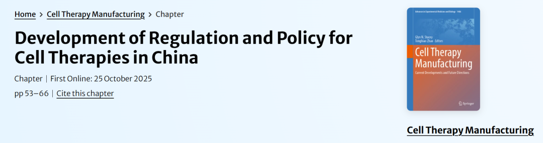 当中国细胞治疗产业迈入临床与商业化的关键窗口期,一篇发表在AEMB(Advances in Experimental Medicine and Biology) 的文章,提供了一个重要信号:中国监管体系的国际表达能力正在提升,而中检院(NIFDC)已成为连接前沿技术与监管框架的技术中枢。这是中国细胞治疗监管体系“从追赶到共建国际规则”的体现。