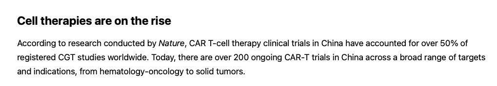 例如,中国的CAR-T临床试验数量占全球一半以上,且取得了许多创新成果。(如下图英文报道所述)