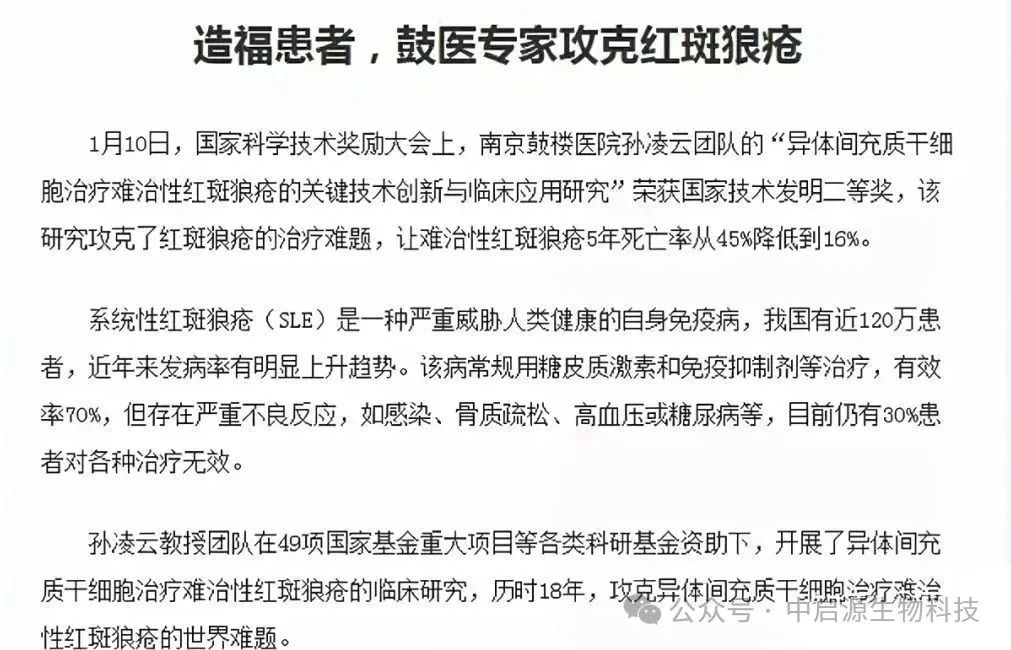 南京大学鼓楼医院孙凌云教授团队历时18年,攻克间充质干细胞治疗难治性红斑狼疮的世界难题,让难治性红斑狼疮5年死亡率从45降低到了16%。更重要的是,该团队将间充质干细胞治疗难治性红斑狼疮这一项研究,已推广应用到35家省内外单位。
