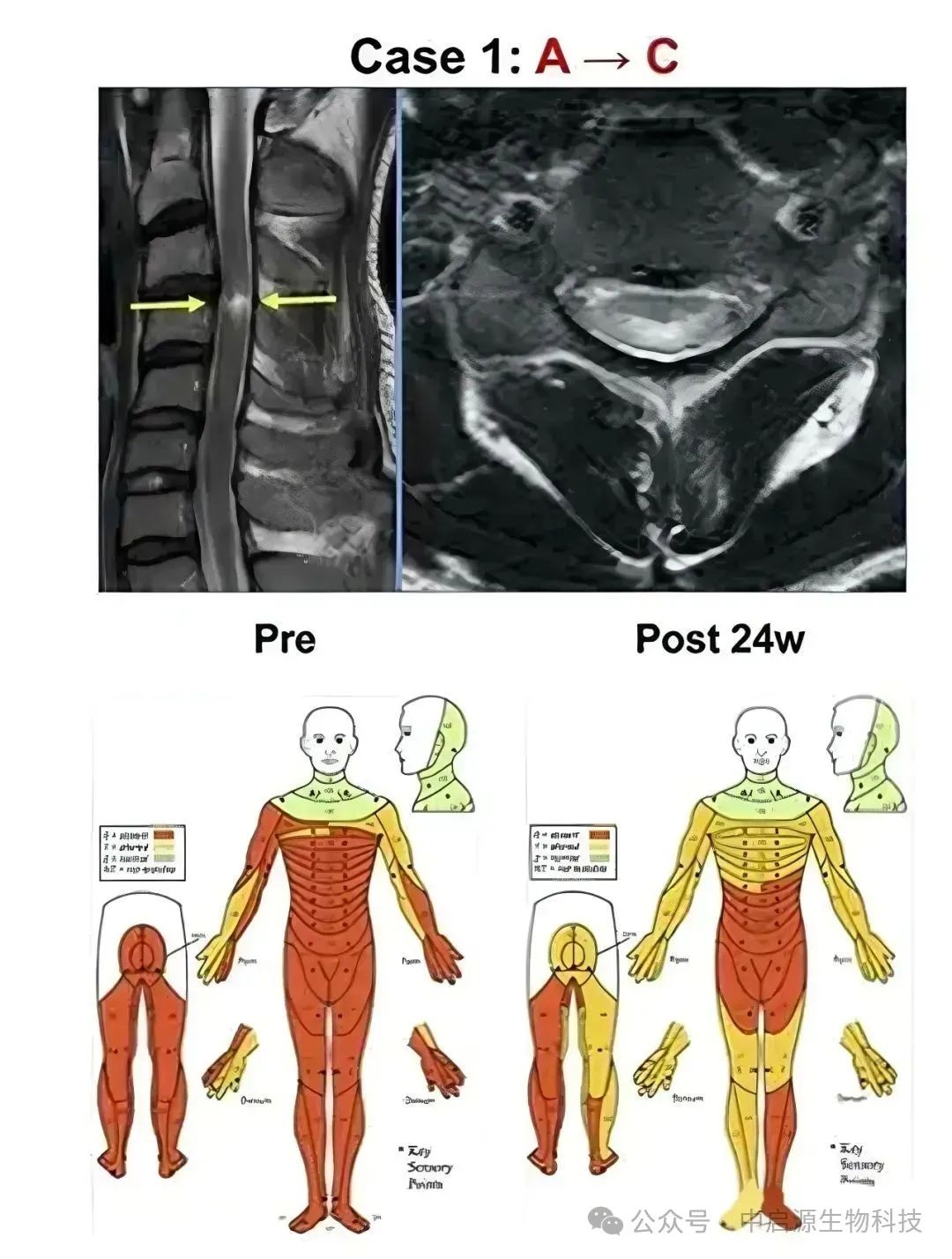 一项已进入临床II期试验的研究对13例不同程度脊髓损伤患者进行间充质干细胞输注。值得注意的是,这13名患者脊髓损伤均较为严重,其中一名为34岁的男性,从1.5米高空坠落,导致C5脊髓损伤,卧床无法站起。治疗6个月后,13例患者中有12例患者神经功能得到明显改善,且ASIA(美国脊髓损伤协会损伤量表)评分均下降。