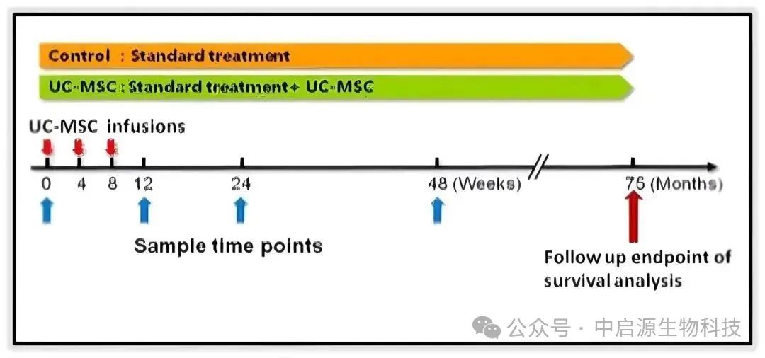 中国科学院院士王福生团队开展了一项随访时间长达75个月的随机对照试验研究,该研究共纳入219例乙肝相关失代偿期肝硬化患者。该219例患者共同接受常规治疗,其中108例患者每隔4周额外输注脐带间充质干细胞,共输注3周。